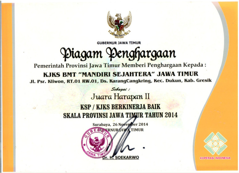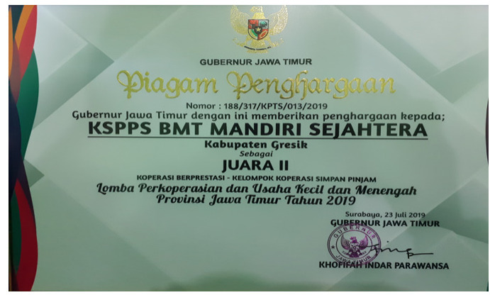 Juara 2 Koperasi Berprestasi kelompok Koperasi Simpan Pinjam Provinsi Jawa Timur tahun 2019