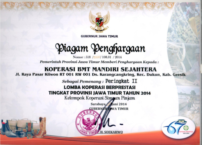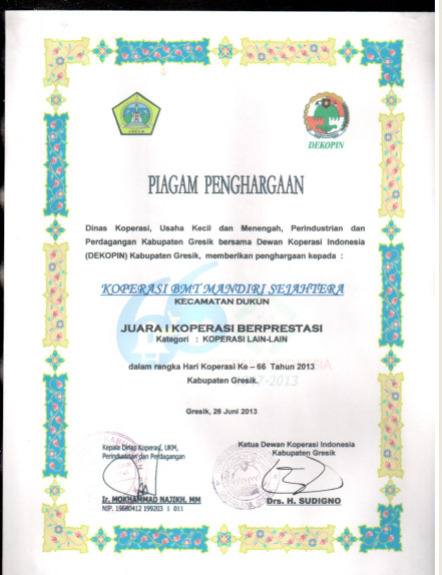 Dan pada tahun 2006 mulai berbadan hukum wilayah Kabupaten Gresik dengan No. 03.BH/403.62/VI/2006 tanggal 13 Juni 2006. Dan pada tgl 20 Oktober 2011 beralih bina ke Provinsi Jawa Timur dengan nama Koperasi BMT Mandiri Sejahtera Jawa Timur (P2T/39/09.06/X/2011).